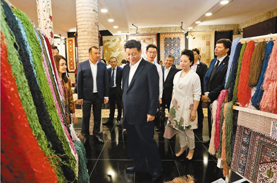 習近平和彭麗媛走進波依卡揚建筑群旁的一家地毯和絲綢作坊。紡織女工們正在制作布哈拉傳統(tǒng)手工地毯,用嫻熟的技藝織成色彩斑斕的圖案。 王滬寧、栗戰(zhàn)書、楊潔篪等陪同參觀。 |