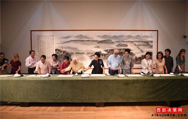 在觀看“意象中國”書畫展時,彭麗媛和來賓們在《西溪紀勝圖》、《朱荷圖軸》等經(jīng)典國畫作品前駐足觀看,接著欣賞4位著名書畫家現(xiàn)場聯(lián)袂創(chuàng)作書畫作品《江南憶》。一位書法家還為來賓們現(xiàn)場示范毛筆的執(zhí)筆、運筆方式。彭麗媛邀請來賓們一同書寫漢字“和”。她說,“和”字在漢語里具有“和平”、“和諧”之義,是我們對世界的共同心愿。來賓們饒有興致地拿起毛筆各自書寫,并展示自己的書法作品。彭麗媛說,昨晚各位在西湖邊觀看了精彩的文藝演出,今天我們在這里一同欣賞畫中的西湖。她同來賓們在國畫《西湖秋勝》前合影留念。