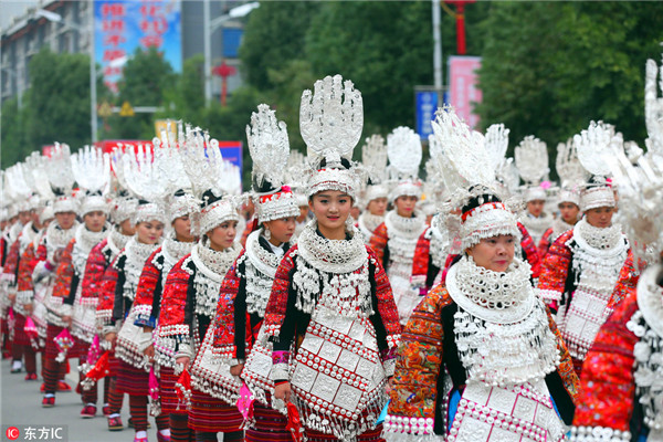 2016年10月11日,貴州省黔東南劍河縣城少數(shù)民族同胞身著節(jié)日盛裝巡游,歡慶仰阿莎節(jié)。當(dāng)日,劍河縣在縣城舉行隆重的仰阿節(jié)文化節(jié)暨縣城搬遷10周年慶?;顒?,此次活動為期三天10月10日至12日。