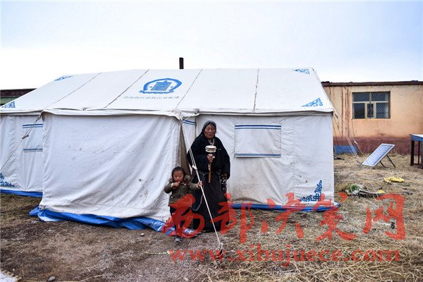 10月18日,雜多縣阿多鄉(xiāng)多加村受災牧民尕文與自己的孫女在救災帳篷前。