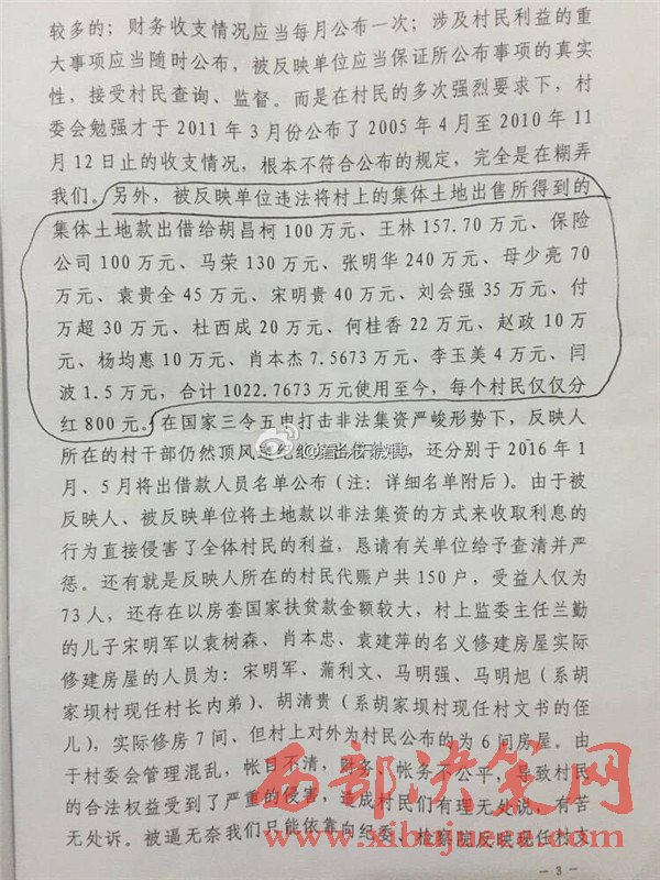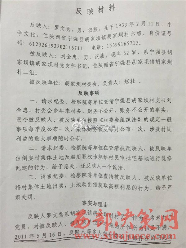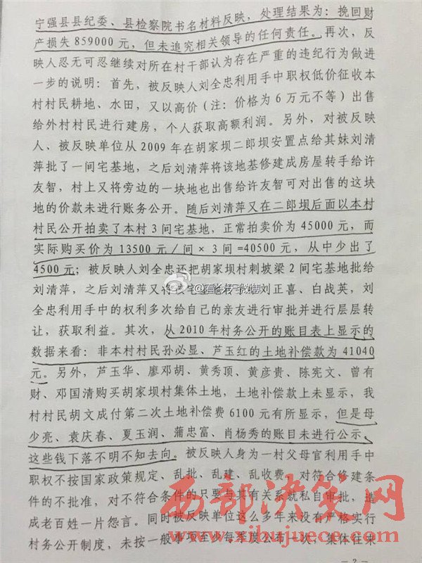 西部決策網(wǎng)訊 近日,有網(wǎng)友微博爆料,陜西省漢中市寧強縣胡家壩鎮(zhèn)胡家壩村,村干部劉全忠利用惠民政策,套取國家大量資金。對于國家扶貧項目,巧立名目、貪污、侵占村民利益。濫用職權(quán)違規(guī)審批宅基地,倒賣村集體土地,并將村上千萬余元出借他人賺取利息,且村務不公開、賬務弄虛作假、嚴重違紀行為。