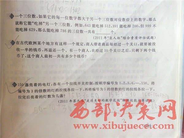 “150盞亮著的電燈,各有一個拉線開關控制,被順序編號為1,2,3,4,…,150。將編號為3的倍數(shù)的燈的拉線各拉一下,再將編號為5的倍數(shù)的拉線各拉一下,拉完后亮著的燈數(shù)為幾盞?”這是一道考公因數(shù)和公倍數(shù)的思維數(shù)學題,今年暑假,才上完三年級的羅弋在做四年級的數(shù)學競賽題集《培優(yōu)新幫手》時遇到此題,算出答案“90”與標準答案“80”不符,媽媽陳群只當兒子錯了。