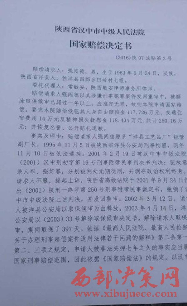 2016年11月9日,陜西省漢中市中級人民法院作出國家賠償決定,國家賠償書上說,根據(jù)《中華人民共和國國家賠償法》的有關(guān)規(guī)定,決定賠償強闖德561893.70元。(強闖德共被羈押2319天,每天按242.30元賠償)。而對于強闖德提出的交通、住宿等費用,以及精神賠償?shù)纫?,不予支持?/span>