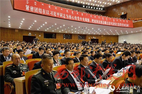 內(nèi)蒙古人民會堂氣氛莊嚴(yán)熱烈。來自全區(qū)各條戰(zhàn)線的黨代表,肩負(fù)重托、滿懷希望,昂首步入會場。主席臺上方懸掛著用蒙古文、漢文書寫的“中國共產(chǎn)黨內(nèi)蒙古自治區(qū)第十次代表大會”的會標(biāo),后幕正中十面鮮艷的紅旗簇?fù)碇鹕鄣狞h徽。二樓的眺臺上懸掛著“緊密團(tuán)結(jié)在以習(xí)近平同志為核心的黨中央周圍,把祖國北部邊疆這道風(fēng)景線打造得更加亮麗”的橫幅。