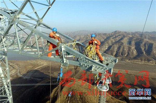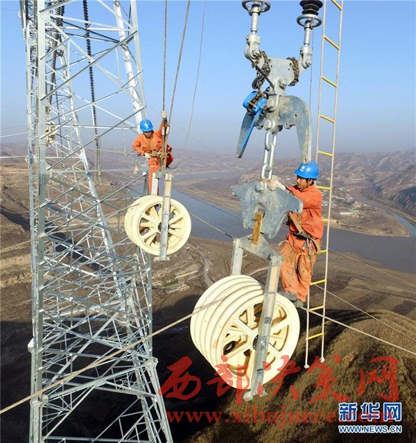 11月30日,施工人員在投放作業(yè)軟梯。當(dāng)日,正在施工的“陜電外送”特高壓工程——1000千伏榆(林)橫(山)至濰坊特高壓交流工程,在陜西省清澗縣與山西省石樓縣之間成功跨越黃河。作為落實(shí)國(guó)家大氣污染防治行動(dòng)計(jì)劃重點(diǎn)建設(shè)的12條輸電通道之一,1000千伏榆(林)橫(山)至濰坊特高壓交流工程是首個(gè)“陜電外送”的特高壓大通道,實(shí)施后將帶動(dòng)陜北煤炭高效清潔利用,減輕煤炭運(yùn)輸壓力,助力陜西能源產(chǎn)業(yè)轉(zhuǎn)型升級(jí),并有效緩解京津冀魯?shù)貐^(qū)電力供應(yīng)緊張和大氣污染。
