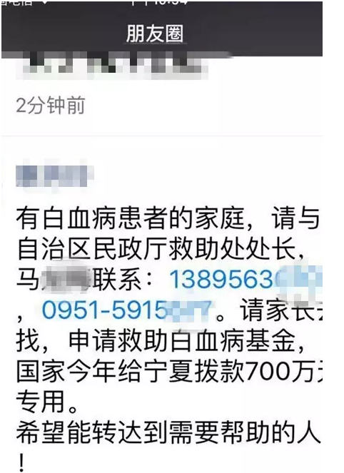 3日開始,該微信在多個朋友圈中刷屏,還公布了工作人員的手機,當(dāng)天,多個網(wǎng)友撥打該手機申請或詢問是否能申請救助白血病基金。“剛開始還一頭霧水,后來看到了同事轉(zhuǎn)發(fā)給我的朋友圈截圖,才明白過來。”