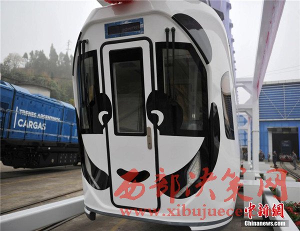 記者在現(xiàn)場看到,正式下線的空鐵車身為卡通熊貓山水圖案,酷似“熊貓”,每列定員144人,時速最高可達65公里。列車采用“大容量動力蓄電池充放電控制技術”,通過實現(xiàn)高倍率放電,提高列車起動加速性能及對極限環(huán)境的適應性,同時能將400千瓦的電制動功率全部用于動力電池快速充電,實現(xiàn)制動能量回收再利用,延長蓄電池續(xù)航里程達120千米。圖為車身外繪制有熊貓山水圖案。
