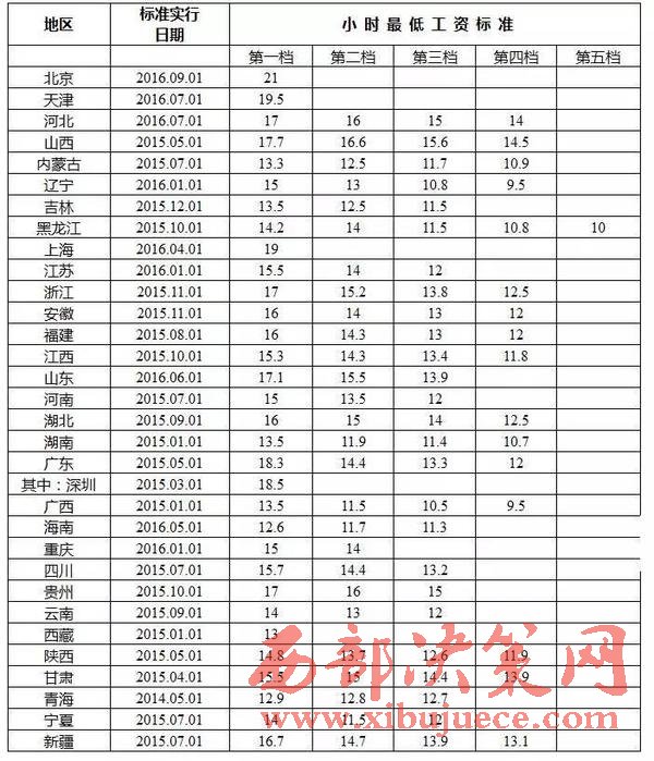 同一天,人社部勞動(dòng)關(guān)系司公布的《全國(guó)各地區(qū)小時(shí)最低工資標(biāo)準(zhǔn)情況》則顯示,小時(shí)最低工資標(biāo)準(zhǔn)中,北京最高,為21元,其次是天津,為19.5元。