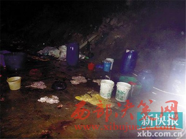 在查獲現(xiàn)場,違法人員臨時搭建的私宰帳篷里,地上鋪滿了豬血和豬毛的混合物,生豬糞便隨著水流漸漸形成一條“小河”流向遠(yuǎn)處,殺豬刀、鐵鉤、鐵叉等用于私宰的工具隨意擺放在地上,與豬毛、豬血、糞便等混合在一起。現(xiàn)場一口直徑近2米的大鍋盛滿了水,熱氣騰騰。