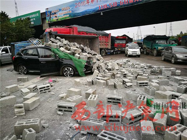 柳北大隊事故處理民警趕到現場看到,運磚的大貨車側翻在地,一車的方磚撒了一地,而一輛黑色寶駿車靠在大貨車車頭處,車身和引擎蓋上堆滿了磚頭。寶駿車受損嚴重,前后擋風玻璃被磚頭砸壞,車頂有一定程度的塌陷,車子右側兩個輪胎被壓扁,車內的安全氣囊也爆了出來。