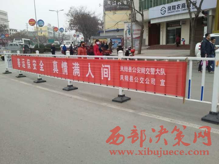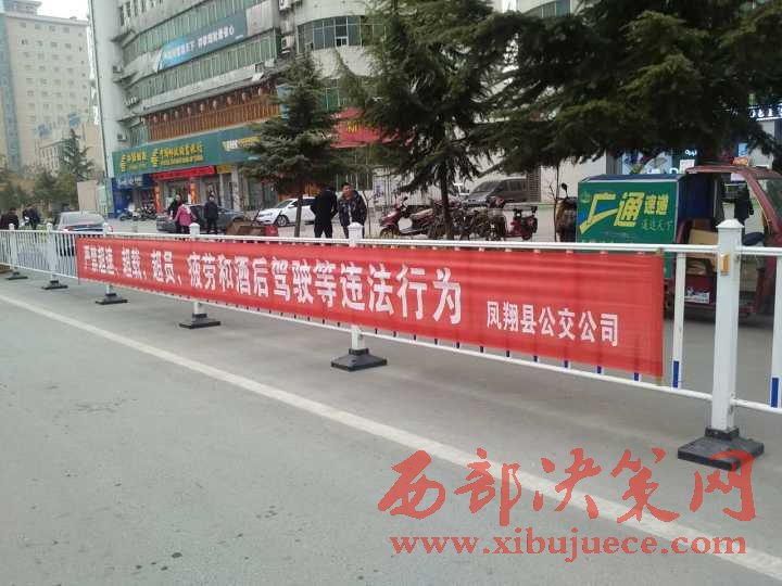 西部決策網(wǎng)訊(帥華鋒 李亮亮 通訊員 孟歡)為切實(shí)做好2017年春運(yùn)期間道路交通安全宣傳工作,引導(dǎo)群眾安全、文明出行,營(yíng)造和諧、平安的春運(yùn)道路交通安全氛圍。近日,鳳翔大隊(duì)根據(jù)汽車(chē)客運(yùn)站、鎮(zhèn)街要道春運(yùn)期間人流車(chē)流量較大的特點(diǎn),將印有“文明交通你我他,平安出行靠大家”、“祝千家萬(wàn)戶(hù)家家團(tuán)圓 愿四方旅客路路平安”、“秩序保障安全,規(guī)則守護(hù)生命”、“滴酒不沾,一路平安”等交通安全宣傳標(biāo)語(yǔ)的橫幅懸掛在東大街、南大街、東大街、秦鳳路等主干道防護(hù)欄醒目位置,為春運(yùn)安全行駛營(yíng)造濃厚的宣傳氛圍。
