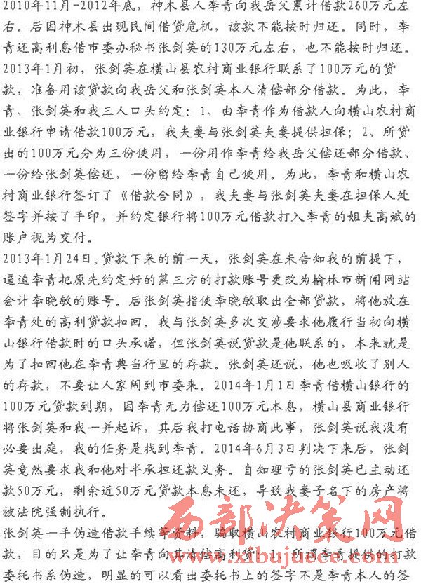 網友微信公眾號 江嶼濯浪爆料 2010年11月-2012年底,神木縣人李青向我岳父累計借款260萬元左右。后因神木縣出現民間借貸危機,該款不能按時歸還。同時,李青還高利息借市委辦秘書張劍英的130萬元左右,也不能按時歸還。2013年1月初,張劍英在橫山縣農村商業(yè)銀行聯(lián)系了100萬元的貸款,準備用該貸款向我岳父和張劍英本人清償部分借款。為此,李青、張劍英和我三人口頭約定:1、由李青作為借款人向橫山農村商業(yè)銀行申請借款100萬元,我夫妻與張劍英夫妻提供擔保;2、所貸出的100萬元分為三份使用,一份用作李青給我岳父償還部分借款、一份給張劍英償還,一份留給李青自己使用。為此,李青和橫山農村商業(yè)銀行簽訂了《借款合同》,我夫妻與張劍英夫妻在擔保人處簽字并按了手印,并約定銀行將100萬元借款打入李青的姐夫高斌的賬戶視為交付。