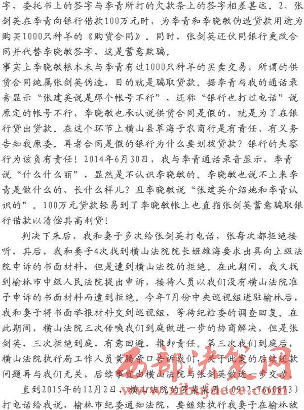 事實上李曉敏根本未與李青有過1000只種羊的買賣交易,所謂的供貨合同純屬張劍英偽造,目的就是騙取貸款。據李青與我的通話錄音顯示“張建英說是那個帳號不行”,還稱“銀行也打過電話”說原定的帳號不行,李曉敏也承認說供貨合同是假的,就是為了在銀行貸出貸款。在這個環(huán)節(jié)上橫山縣草海子農商行是有責任、有義務告知我原委。再者合同是假的銀行為什么要劃撥貸款?銀行的失察行為該負有責任!2014年6月30日,我與李青通話錄音顯示,李青說“什么什么麗”,顯然是不認識李曉敏的。李曉敏也說不上來李青是做什么的、長什么樣兒?且李曉敏說“張建英介紹她和李青認識的”。100萬元貸款輕易到了李曉敏帳上也直指張劍英蓄意騙取銀行借款以清償其高利貸!