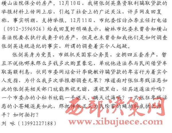 直到2015年的12月2日,橫山法院的羅某某用(0912-7660873)打電話給我說,榆林市紀委通知法院,要繼續(xù)執(zhí)行我妻子在榆林被橫山法院保全的房產。12月10日,我將張劍英集資取利騙取貸款的舉報材料上傳網上后,引起了社會上的廣泛關注,許多網友回復稱,事實明朗,支持舉報。12月11日,市紀委信訪辦李主任打電話(0912-3596926)給我回復時明確表示,榆林市紀委未曾告知橫山縣法院要求執(zhí)行我妻子的房產,但是也未曾告知我他們是如何調查張劍英違規(guī)違紀的事實,所謂的調查著實令人起疑。