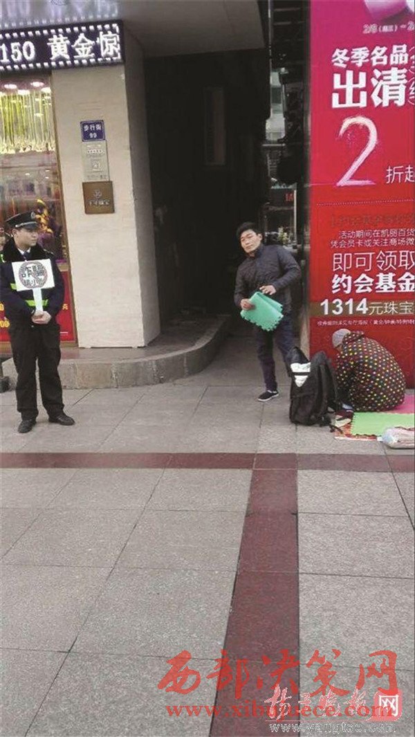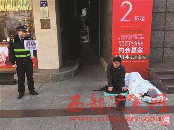 元宵節(jié)當(dāng)天,張家港沙洲路步行街一商場樓下,一名年輕男子以母親患重病為由跪地乞討,"母親"就躺在地上,旁邊站著一名城管協(xié)管員,舉起了寫著"詐騙請小心"的牌子。被攪了局的"行乞者"最后只能逃之夭夭。據(jù)當(dāng)事城管協(xié)管員介紹,乞討男子是個"熟面孔",當(dāng)天曾躲進(jìn)小弄堂里抽煙打電話,用的是蘋果手機,抽的是中華煙,這讓他們更加確信,男子是職業(yè)行乞,根本不是家中有困難。揚子晚報全媒體記者於蘇云