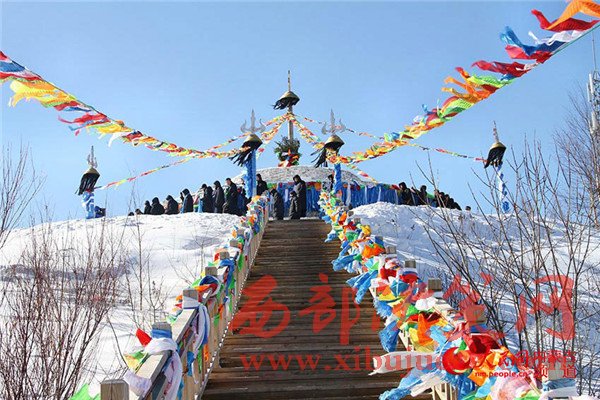 23日上午,阿爾山當(dāng)?shù)氐拿晒抛迥撩駛兩碇⒀b,將羊肉、奶酒、奶食品等祭品匯集于興安敖包前,敬獻(xiàn)藍(lán)色哈達(dá),并繞敖包誦經(jīng),祈求風(fēng)調(diào)雨順、家人安康。
