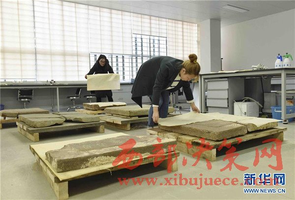 2月27日,成都考古研究所文物保護與修復(fù)中心工作人員在對清洗干凈的墓志進行防塵保護。