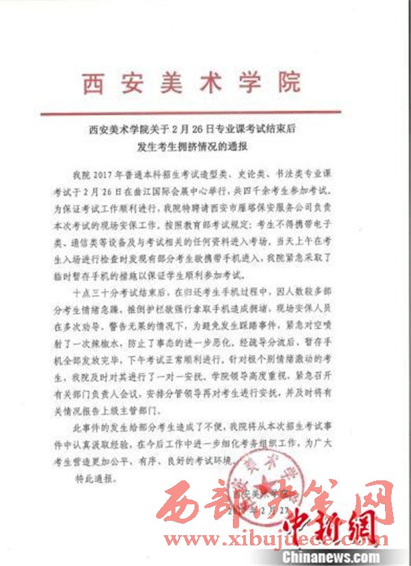 西安美術(shù)學(xué)院發(fā)布的事件通報(bào)稱,考試結(jié)束后,在歸還手機(jī)過程中,因人數(shù)較多部分考生情緒急躁,推倒護(hù)欄欲強(qiáng)行拿取手機(jī)造成擁堵,現(xiàn)場(chǎng)安保人員在多次勸導(dǎo)、警告無果的情況下,為避免發(fā)生踩踏時(shí)間,緊急對(duì)空噴射了一次辣椒水,防止了事態(tài)的進(jìn)一步惡化。經(jīng)疏導(dǎo)分流后,暫存手機(jī)全部發(fā)放完畢,下午考試順利進(jìn)行。針對(duì)個(gè)別情緒激動(dòng)的考生,該院即使對(duì)其進(jìn)行了一對(duì)一安撫。學(xué)院領(lǐng)導(dǎo)高度重視,緊急召開有關(guān)部門負(fù)責(zé)人會(huì)議,安排分管領(lǐng)導(dǎo)再對(duì)考生進(jìn)行安撫,并及時(shí)將有關(guān)情況報(bào)告上級(jí)主管部門。此事件的發(fā)生給部分考生造成了不便,該院將從本次招生考試事件中認(rèn)真汲取經(jīng)驗(yàn),在今后工作中進(jìn)一步細(xì)化考務(wù)組織工作,為廣大考生營(yíng)造更加公平、有序、良好的考試環(huán)境。