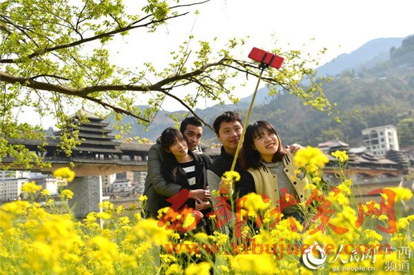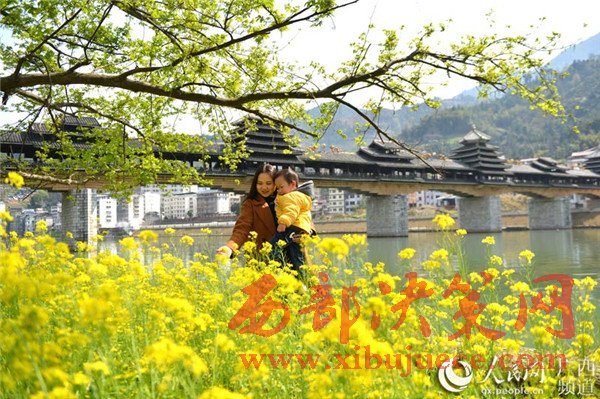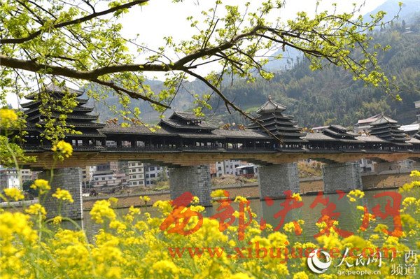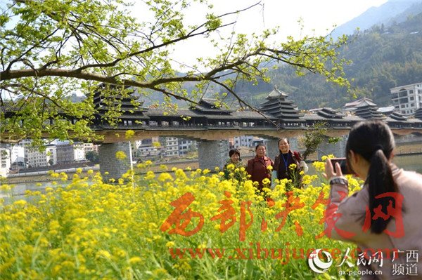 春暖花開時(shí)節(jié),廣西龍勝各族自治縣民族風(fēng)雨橋旁的油菜花競(jìng)相綻放,風(fēng)雨橋在油菜花的點(diǎn)綴下美不勝收,形成了一道美麗的春天景致,充滿著濃郁的春天氣息,吸引眾多游客前來(lái)觀賞拍照。