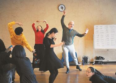 茲維卡(右)指導(dǎo)學(xué)員伴隨著音樂的節(jié)拍進(jìn)行舞動(dòng)。