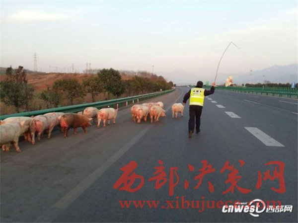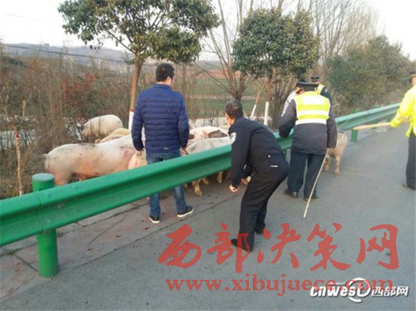貨車側(cè)翻生豬高速上撒歡,西安交警揮鞭子趕豬回圈。