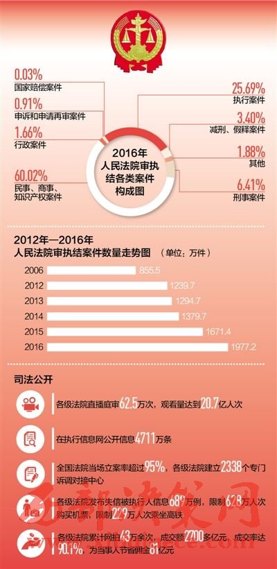 2016年,各級(jí)法院向執(zhí)行難全面宣戰(zhàn),共受理執(zhí)行案件614.9萬(wàn)件,執(zhí)結(jié)507.9萬(wàn)件,同比分別上升31.6%和33.1%,執(zhí)行到位金額1.5萬(wàn)億元,同比上升54%。與公安部等10多個(gè)部門(mén)建立網(wǎng)絡(luò)執(zhí)行查控系統(tǒng),執(zhí)行法官足不出戶(hù)即可依法查詢(xún)被執(zhí)行人財(cái)產(chǎn)和相關(guān)信息,實(shí)現(xiàn)了執(zhí)行模式的根本變革。發(fā)布失信被執(zhí)行人信息689萬(wàn)例,限制628萬(wàn)人次購(gòu)買(mǎi)機(jī)票,限制229萬(wàn)人次乘坐高鐵。依法懲治拒不執(zhí)行裁判行為,司法拘留1.6萬(wàn)人,追究刑事責(zé)任2167人,讓司法裁判真正成為懲治違法失信的利劍。