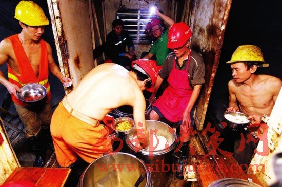 由于上下班路途較遠(yuǎn),工人們每個(gè)班要在隧洞內(nèi)工作18個(gè)小時(shí)左右。臨近中午,隧洞小火車送來了午飯。打開保溫桶,四菜一湯熱氣騰騰。兩葷兩素,米飯管飽,湯管夠。吃完飯,工人們又投入到了緊張的工作中去了,他們在期盼著把漢江水引到關(guān)中的那一天。