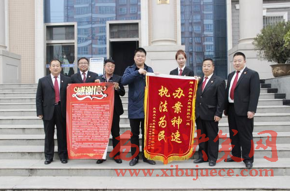 西部決策網(wǎng)訊(帥華鋒 劉恒)3月20日上午,鳳翔大千汽車租賃有限公司總經(jīng)理王某專程送來 “辦案神速 執(zhí)法為民”的錦旗與感謝信,向鳳翔法院執(zhí)行一庭干警王宏斌及執(zhí)行局全體干警表達謝意,感謝他們在辦案中不辭辛苦,公正執(zhí)法,有力的維護了當事人合法權益。