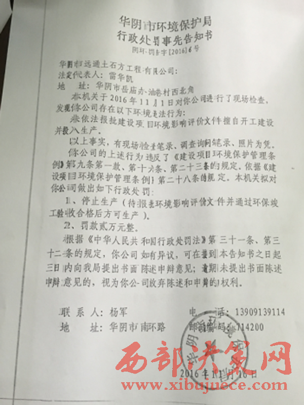 一份2016年11月23日《華陰市環(huán)境保護(hù)局行政處罰決定書》復(fù)印件顯示,環(huán)保局于2016年11月1日對(duì)該公司進(jìn)行了現(xiàn)場(chǎng)檢查,發(fā)現(xiàn)該公司存在未依法報(bào)批建設(shè)項(xiàng)目環(huán)境影響評(píng)價(jià)文件擅自開工建設(shè)并投入生產(chǎn)。處罰是停止生產(chǎn)和罰款2萬元。