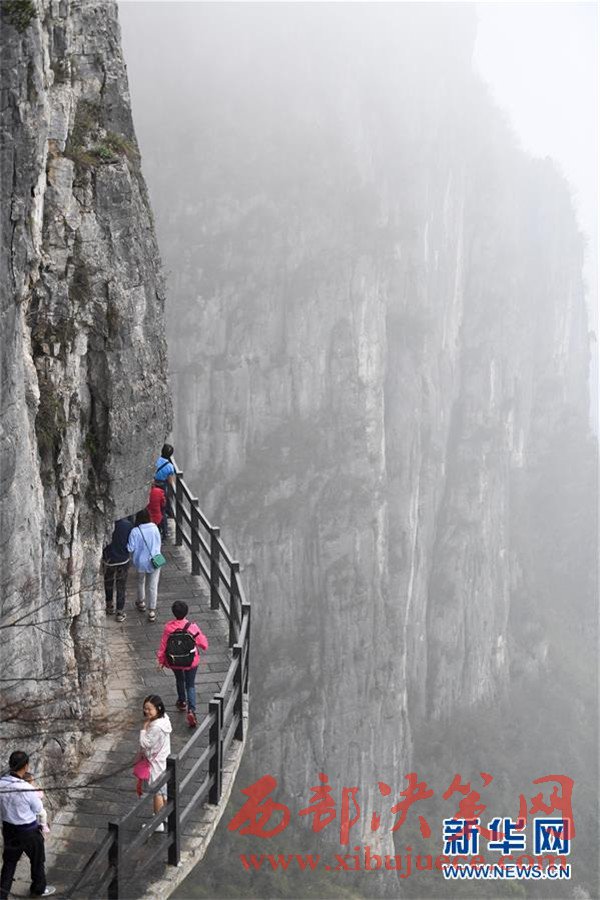 4月16日,游客在恩施大峽谷的絕壁棧道上游覽。恩施大峽谷位于湖北恩施土家族苗族自治州恩施市境內(nèi),景區(qū)內(nèi)有峽谷、地縫、絕壁、奇峰等地質(zhì)景觀,十分壯美。