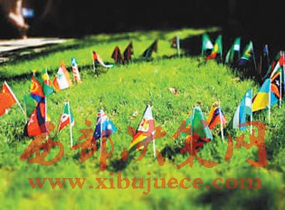南南學(xué)院院內(nèi)的草地上插著20多個(gè)國家的小國旗。