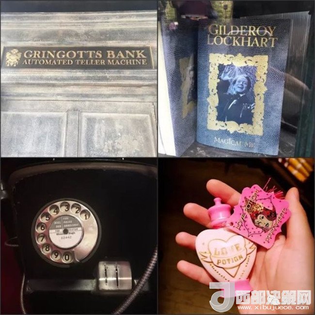 左下:電話(huà)亭里的魔法部 電話(huà)號(hào)碼;韋斯萊魔法笑料店的愛(ài)情魔藥
