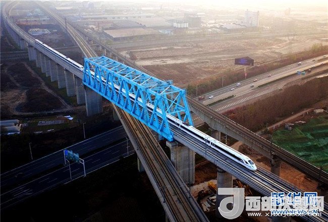 西成高鐵由西安北站駛出的列車經(jīng)過(guò)西成高鐵跨西寶高鐵特大橋(12月6日攝)。12月6日,西安至成都高速鐵路全線開(kāi)通運(yùn)營(yíng),兩地的最短旅行時(shí)間壓縮至4小時(shí)7分。