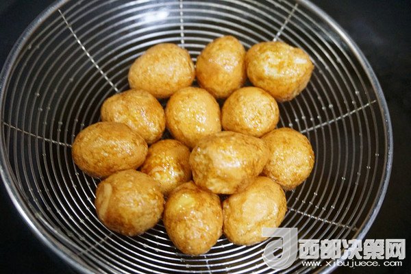 4、油燒到7成熱,倒入鵪鶉蛋,快速炸到金黃,表面金黃即可,炸的時間不要太長,不然口感老了就不好。