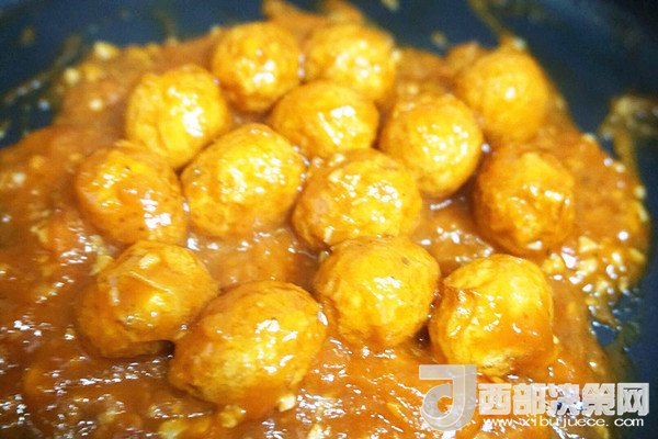 7、放入虎皮蛋,再加入番茄醬,加入適量水,蓋蓋子燜5分鐘,直到收汁即可。
