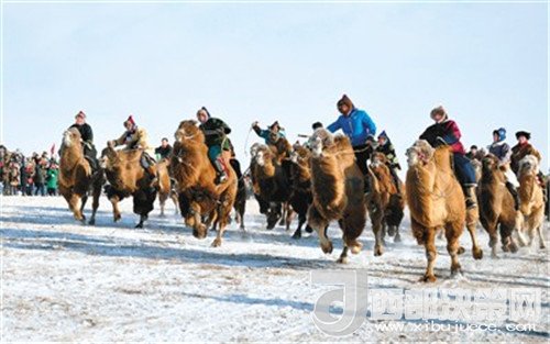 這邊還沒有欣賞完駱駝的高大靜美,馬隊的馳騁再次讓觀眾熱血沸騰。一縱疾馳的駿馬驕傲地揚著頭顱,鬢毛高高飛起,厚重的積雪并沒有減慢馬兒奔跑的速度,雪團如碎銀一般在它們腳下飛灑,而騎手們紅綠藍各異的蒙古皮袍也分外吸引眼球。緊接著還有射箭、駱駝拉爬犁等精彩表演。