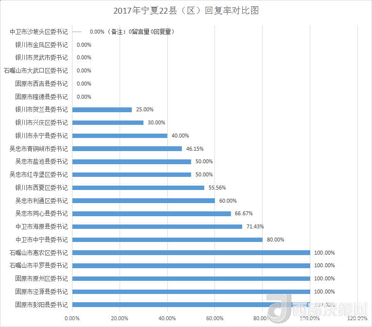 近日,人民網記者通過對人民網《地方領導留言板》寧夏版塊進行梳理,發(fā)布2017年人民網《地方領導留言板》寧夏辦理情況報告。數據顯示,2017年全年寧夏回族自治區(qū)黨政一把手、中衛(wèi)市黨政一把手、22個縣(區(qū))委書記中有5位都保持了100%回復率。但是,市級黨政一把手和縣(區(qū))委書記中都有0回復墊底現象。