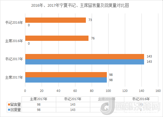 據統計,2017年,人民網網友分別給寧夏黨委書記、政府主席公開留言143條和98條,同期增長幅度較大,其中書記留言量增長49%。值得點贊的是,書記、主席全年的回復率達100%,各項數據均創(chuàng)新高。