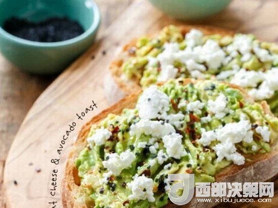高B格吃法,牛油果配山羊芝士配點(diǎn)兒芝麻和干辣椒,涂在吐司上。