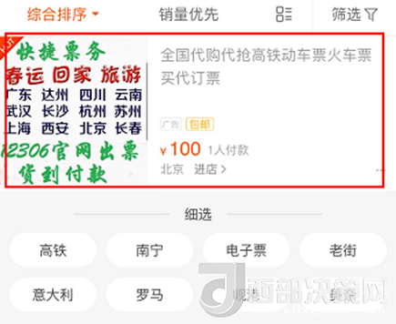 1月30日下午,人民網(wǎng)IT頻道在某著名電商平臺搜索“火車票代購”,在首屏也能搜到疑似黃牛的賣家,其廣告圖片里就有“春節(jié)回家、12306官網(wǎng)出票”等字樣,標(biāo)價為100元,與這篇報道的黃牛加價情況基本一致。