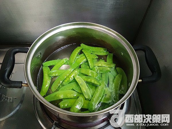 3.煮鍋中放少許油和鹽,水沸后放入荷蘭豆。