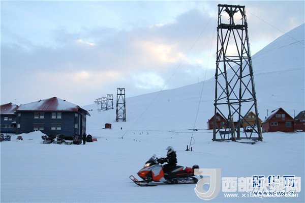 2月25日,在挪威斯瓦爾巴群島首府朗伊爾城,一輛雪地摩托車從已廢棄的運(yùn)煤纜車架前駛過(guò)。新華社記者梁有昶攝