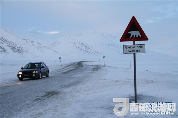 2月25日,在挪威斯瓦爾巴群島首府朗伊爾城,一輛汽車從提示北極熊出沒(méi)的警示路標(biāo)旁駛過(guò)。記者梁有昶攝