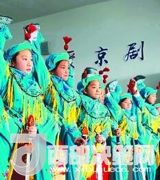 江蘇省海安縣城東鎮(zhèn)西場小學(xué)京劇社團(tuán)的小票友在排練京劇節(jié)目《霸王別姬》。徐勁柏攝/光明圖片