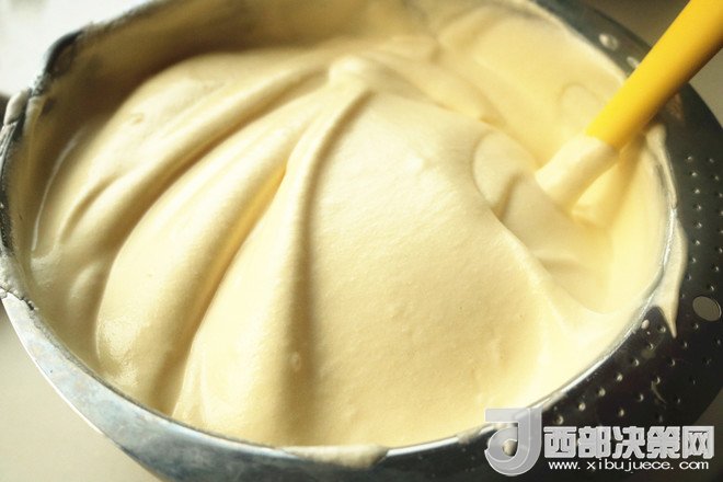 4.繼續(xù)用手抽拌勻,很細(xì)膩?lái)樆?。后蛋法不容易使面糊起筋,做出的蛋糕更?xì)膩,也不易回縮。拌好的蛋黃糊待用。