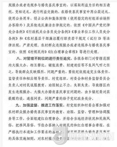 各級各部門對管轄范圍內(nèi)大操大辦、相互攀比、鋪張浪費(fèi)、封建迷信等不良風(fēng)氣聽之任之,導(dǎo)致群眾反映強(qiáng)烈、問題嚴(yán)重的,要依紀(jì)依規(guī)追究主體責(zé)任、監(jiān)督責(zé)任和相應(yīng)領(lǐng)導(dǎo)責(zé)任。村黨組織、村委會和村務(wù)監(jiān)督委員會負(fù)責(zé)人對村民說服教育、勸阻制止不力,失職失責(zé),導(dǎo)致轄區(qū)內(nèi)發(fā)生違規(guī)操辦、大操大辦婚喪喜慶事宜問題的,由鄉(xiāng)鎮(zhèn)紀(jì)委對其提醒約談、通報(bào)問責(zé),問題嚴(yán)重的給予黨紀(jì)政務(wù)處分。