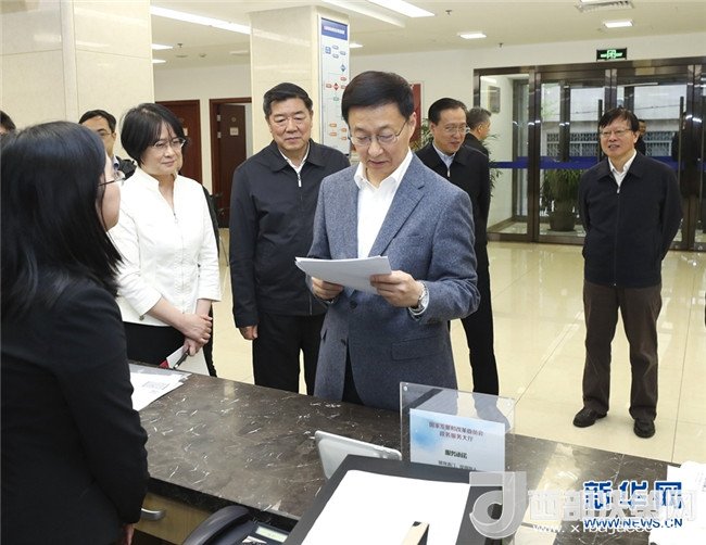 4月3日,中共中央政治局常委、國(guó)務(wù)院副總理韓正到國(guó)家發(fā)展改革委調(diào)研并主持召開(kāi)座談會(huì)。這是韓正在國(guó)家發(fā)展改革委政務(wù)服務(wù)大廳考察。新華社記者 龐興雷 攝