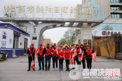 北京市朝陽(yáng)區(qū)實(shí)驗(yàn)小學(xué)雄安校區(qū),參加“家校警”護(hù)學(xué)隊(duì)的當(dāng)?shù)丶议L(zhǎng)志愿者在校門口。