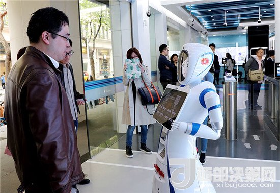 一位市民在位于上海九江路的無(wú)人銀行入口處向迎賓機(jī)器人說(shuō)明需要辦理的業(yè)務(wù)種類(4月12日攝)。近日,中國(guó)建設(shè)銀行在上海九江路開(kāi)出國(guó)內(nèi)首家無(wú)人銀行。新華社記者 方喆 攝
