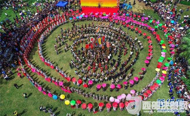 4月18日,在廣西柳州市龍?zhí)豆珗@,人們進行蘆笙踩堂慶祝“三月三”。新華社發(fā)(賴柳生 攝)